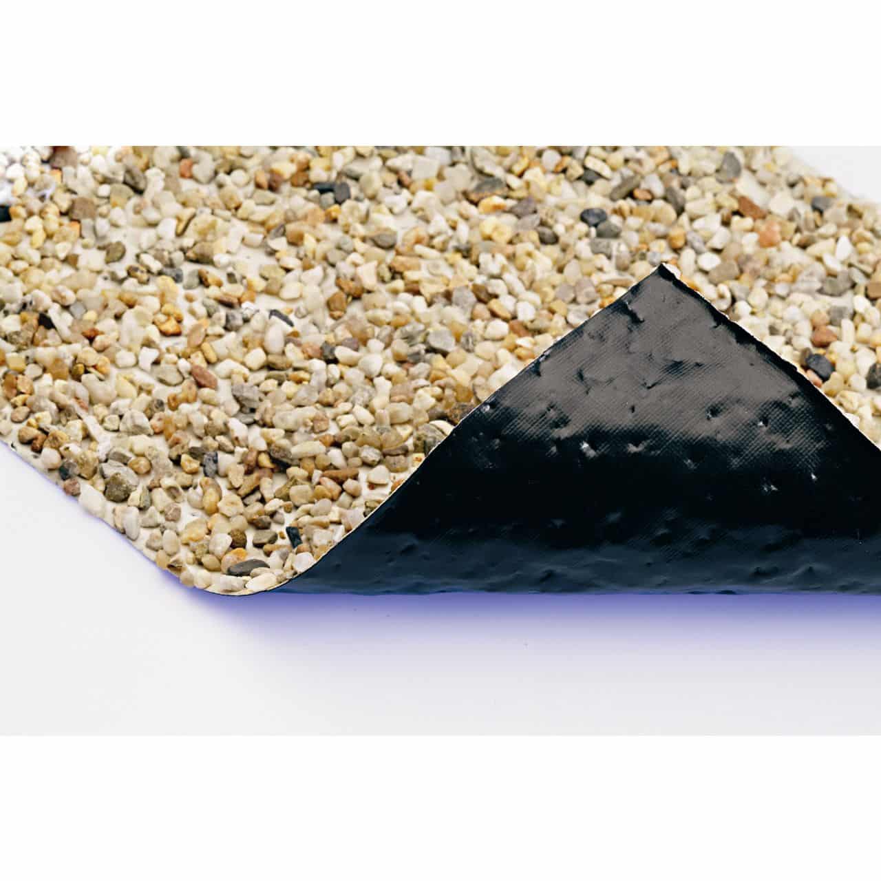 Na crnu PVC foliju posebnom tehnologijom zaljepljeni su kamenčići čime je dobiven proizvod koji čini idealan prijelaz iz vrtnog jezerca u vrt.