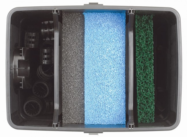Kompletni kompaktni Pontec MultiClear protočni filter osigurava zajamčenu zdravu, čistu i bistru vodu u vrtnim jezercima. Komplet uključuje snažnu filter pumpu, crijevo, integriranu UVC lampu koja učinkovito uklanja suspendirane alge i zamućenost. U kombinaciji sa spužvama razne gustoće koje se nalaze u filteru, ovaj set nudi jamstvo čiste vode. Zahvaljujući indikatoru razine zagađivača i ispustu na dnu, održavanje filtra je lako i jednostavno.